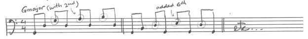 It usually emphasizes the seventh of each chord. But it can also emphasize the third, fifth, and sixth, with each pattern having its own groove and “feel.” Here are several below: